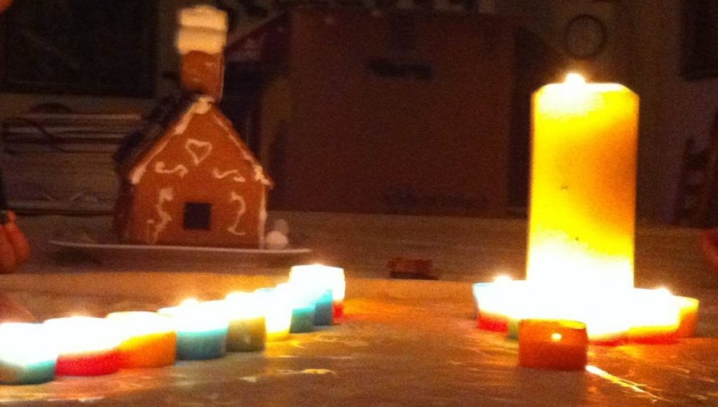 Unsere Kinder brachten dann unser Lebkuchen-Häuschen vorbei, dass sie gestern zusammen mit meiner Cousine gebaut hatten. Außerdem zündeten sie lauter Kerzen an. Ich hatte gar nichts gesagt, aber der Kleine war fasziniert von den flimmernd-leuchtenden Lichtern und es entstand eine Atmosphäre, die mehr Advent war als jede blinkende Lichterkette und jedes leuchtende Rentier auf einem Fenstersims es sein können. Wir saßen zusammen, es war schön und es war friedlich. Und da war ganz viel Wärme.