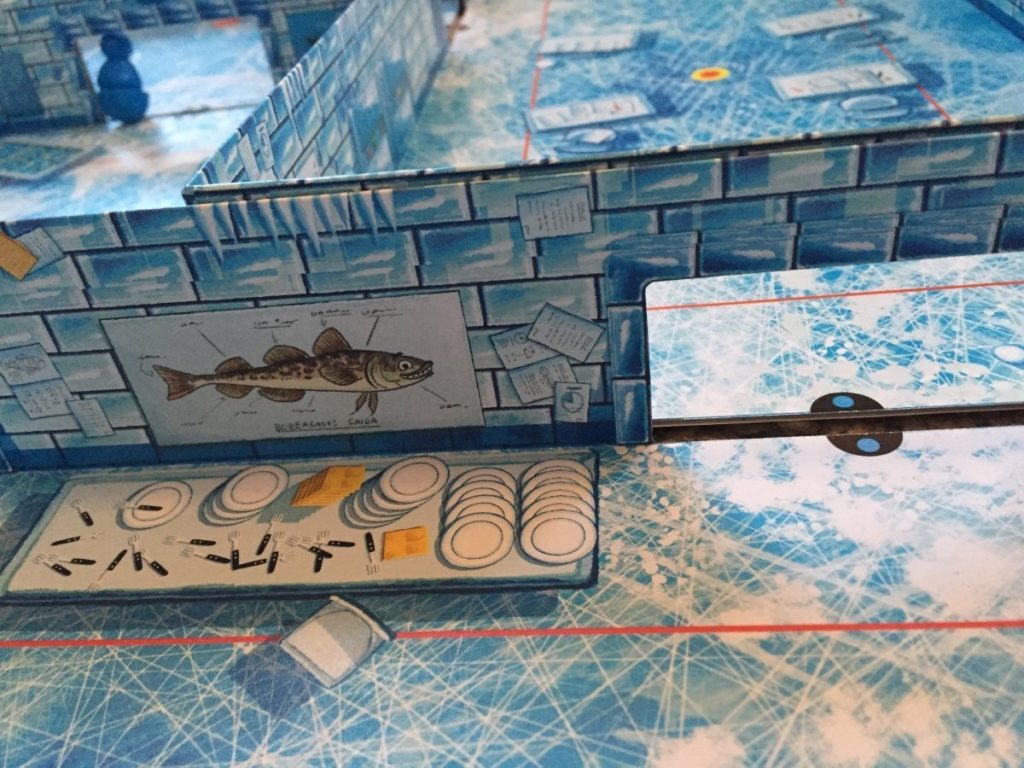 Ziel ist es, durch die Türen in den nächsten Raum zu gelangen. Steckt über der Tür ein Fisch in der Farbe des eigenen Pinguins, darf man sich diesen einstecken und bekommt dafür eine Punktekarte. Darauf ist die Zahl 1, 2 oder 3 vermerkt. Wer am Ende die meisten Punkte auf den Karten stehen hat, gewinnt das Spiel. Aber so weit sind wir noch nicht.
