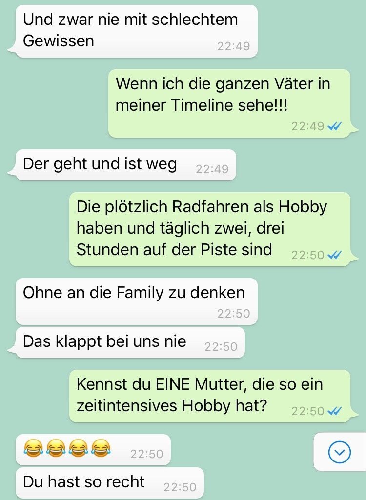 …. und habe eine Weile gebraucht um zu erkennen, dass hauptsächlich ich zurückgesteckt habe seit unsere Tochter auf der Welt ist. Inzwischen habe ich das Rad gedreht und pflege auch mein ICH wieder. An einer Sache merke ich, dass ich eine „späte“ Mutter bin – ich führe diese Art Dialoge nicht per WhatsApp sondern telefonisch oder im persönlichen Gespräch 😉