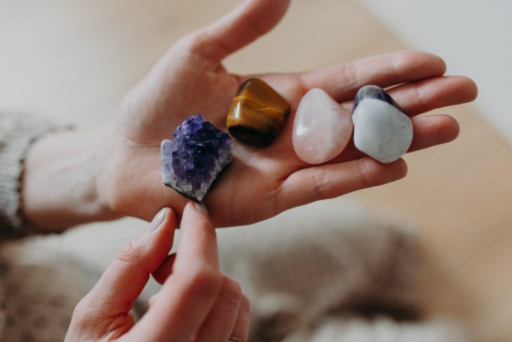 Nach der Geburt meiner Tochter Irma habe ich 2019 eine Ausbildung in Aura-Arbeit gemacht. Hier habe ich gelernt, mit Energien zu arbeiten und Blockaden zu lösen. Dazu haben wir unter anderem auch mit verschiedenen Edelsteinen gearbeitet, die auf bestimmte Körperstellen gelegt werden. Die Energie, die von den Steinen ausgeht, habe ich hier zum ersten Mal sehr bewusst wahrgenommen.
