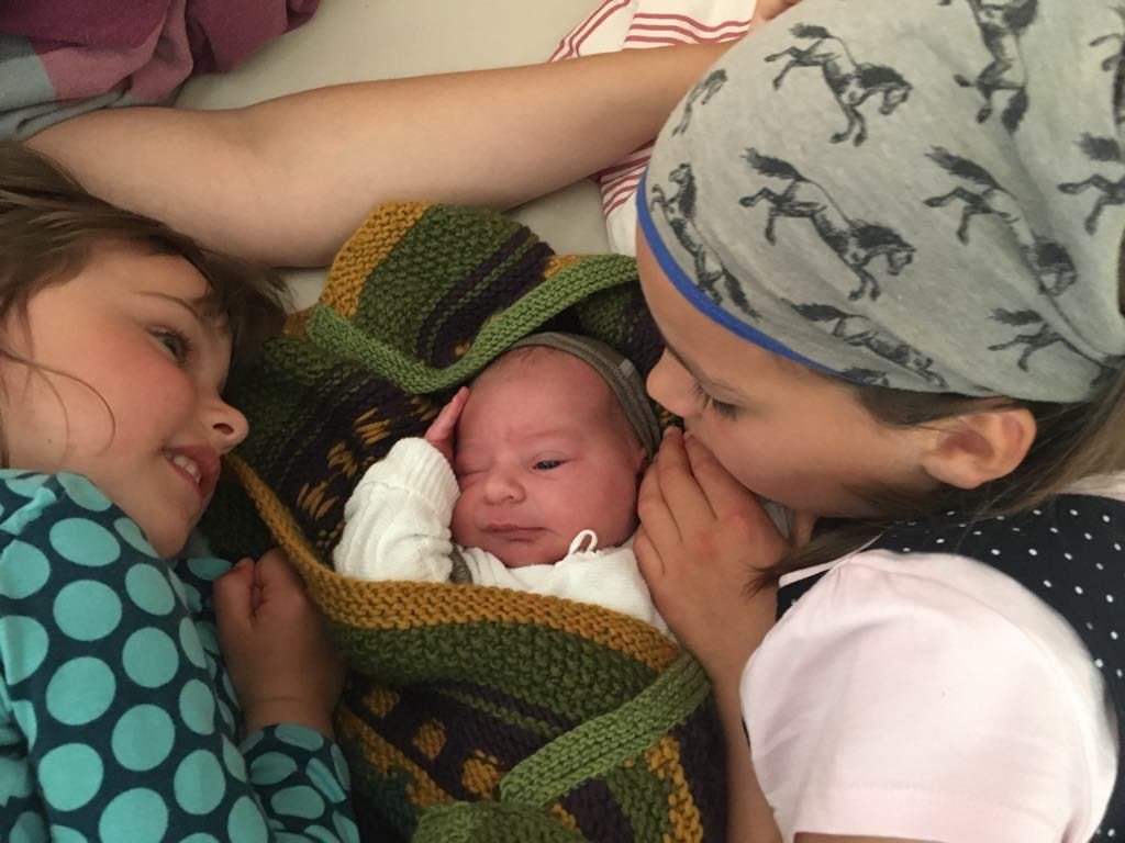 Mein Mann und unsere Hebamme halfen mir aus der Wanne und ins Bett nebenan, wo wir dann alle zu fünft erstmal ganz lange kuschelten. Das Babymädchen trank zwischendurch und die großen Schwestern hatten einige Fragen und wollten dann natürlich auch mal halten und küssen, später dann mit untersuchen und anziehen. Und auch diese Momente bleiben so sehr in Erinnerung und würden mich glatt nochmal zum Schwangerwerden und Gebären verleiten, aber wir sind jetzt komplett. 😉