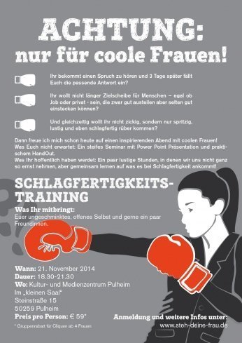 Lernt in unterhaltsamen 3 Stunden, auf was es bei Schlagfertigkeit wirklich ankommt und wie ihr Euch in Zukunft verbal besser aufstellen könnt!