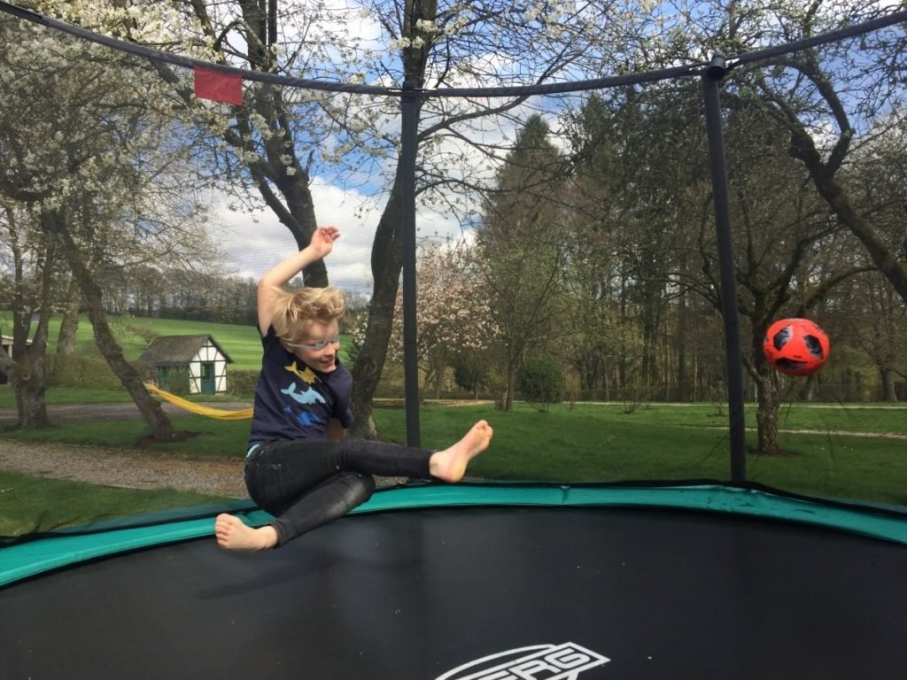 Im letzten Jahr dann haben wir uns – mittlerweile auf dem Land lebend – ein Trampolin für den Garten gekauft. Ein großes. Es war toll, aber leider nicht sicher. Als der Sturm kam, rief ich die Kinder ans Fenster… vorbei flogen Äste und Blätter… und schließlich unser Trampolin. Es landete im Baum über dem Hühnerstall, kein Witz. Und damit war es vorbei mit der schönen Hüpferei.