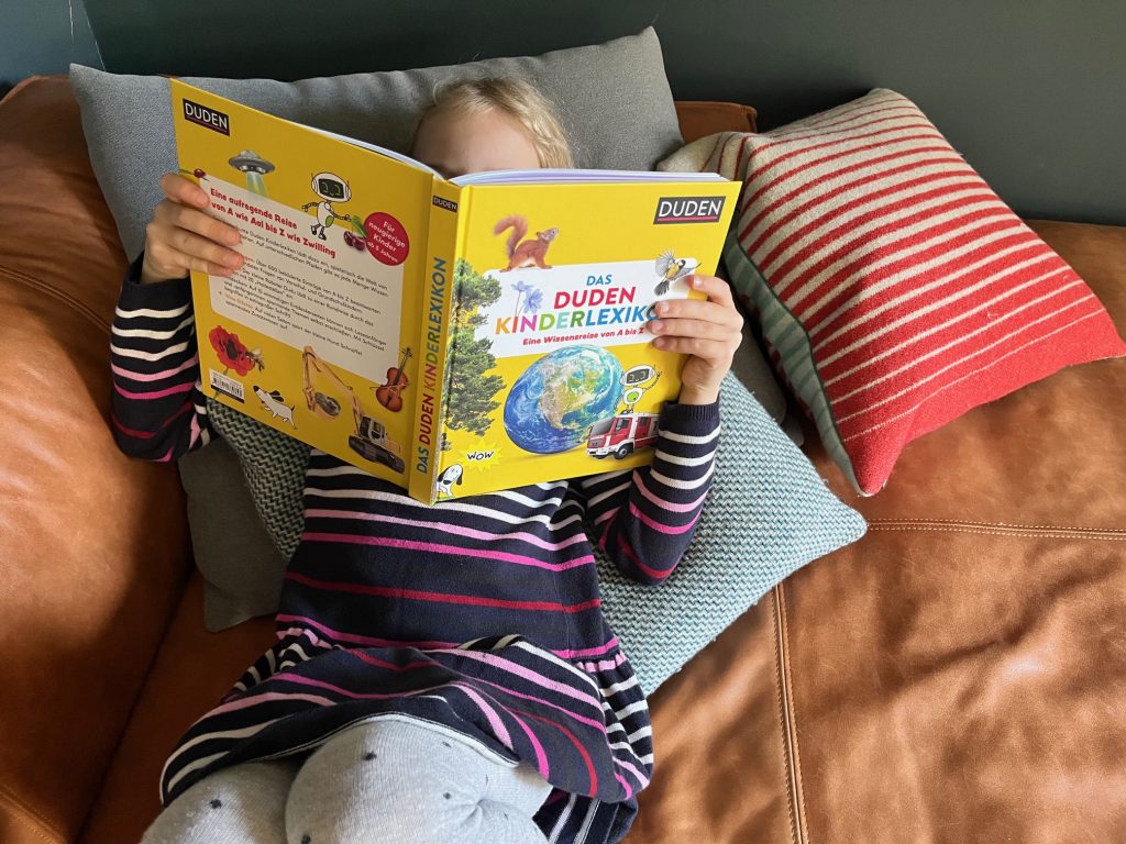 Als ich „Das Duden Kinderlexikon“ bei uns zu Hause auf den Tisch gelegt habe, haben meine beiden Mittleren sofort angefangen, darin zu schmökern. „Wusstest du, dass Kamele 14 Tage lang ohne Trinken überleben können?“, fragte mein Sohn erstaunt? Die Tochter staunte über den Urknall und lernte viel über unseren Weltraum. Das Tolle: Beide beschäftigten lange und vor allem ohne mein Beisein mit dem Lexikon und die Kleine holte es sich extra abends nochmal ins Bett, um vor dem Schlafengehen darin zu blättern.