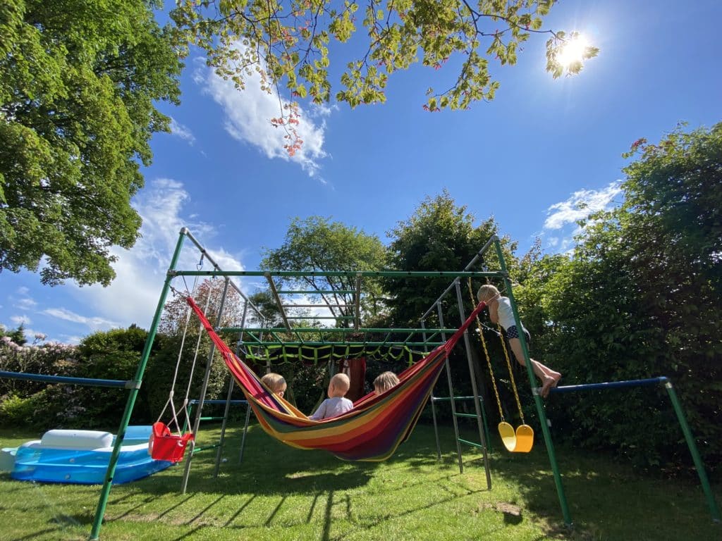 Es konnten halt auch immer nur zwei Kinder gleichzeitig schaukeln und das ganze Gestell außenrum war und ist zum Spielen auch eher ungeeignet. Bei uns im Garten stand noch ein Trampolin, ein Spielhäuschen, Ringe und sogar eine Seilbahn, die wir aus einer Winde und einer Slackline gebaut haben, aber immer wieder machten wir die gleiche Beobachtung: Nach kurzer Zeit standen alle wieder auf der Matte.