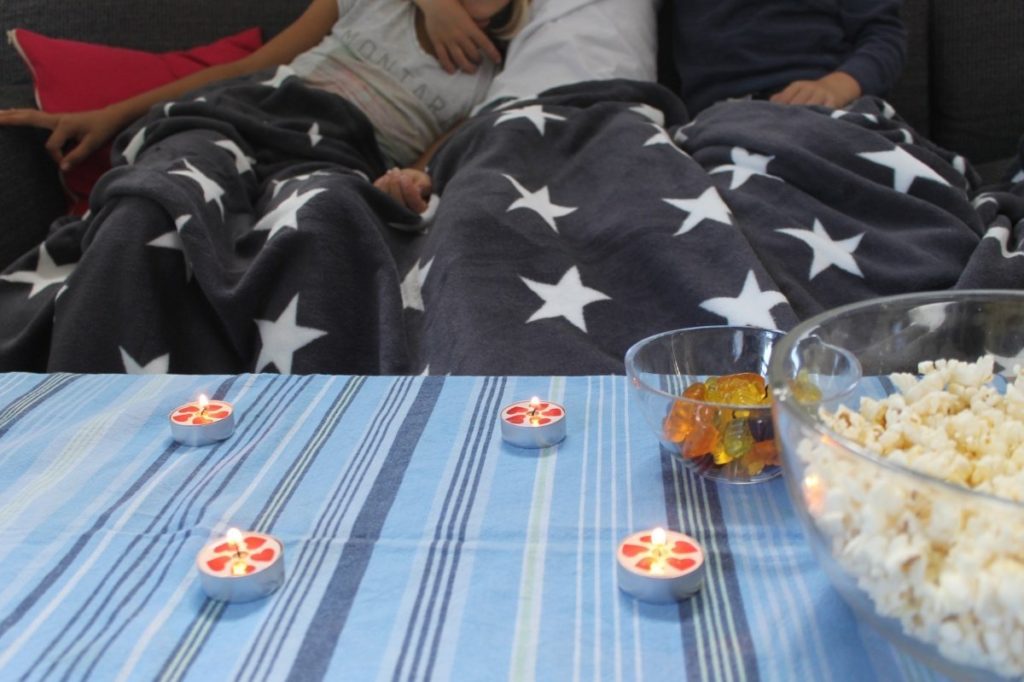 Bei unserem Kuschelkinoabend darf Popcorn auf keinen Fall fehlen und selbstgemachte Pizza, die Katzenpizza ist eine super Idee! Da darf dann auch alles im Wohnzimmer gegessen werden. Und wir kuscheln uns auf die Couch mit vielen Kissen und Decken.
