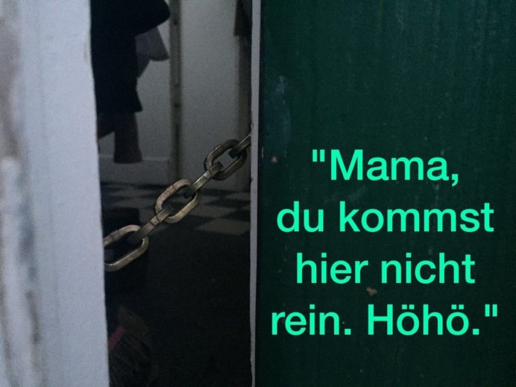 Nun kam ich heute nach der Arbeit nach Hause, hatte kurz Zeit, den Jungs Hallo zu sagen und einen Kaffee zu trinken und musste dann los, unsere Tochter von ihrem Lang-Tag an der Schule abzuholen. Als wir beide zurück zu Hause waren, kamen wir nicht rein. Die Türklinke war mit Tape-Band zugeklebt und unten war das Sicherheitskettchen vorgeschoben.