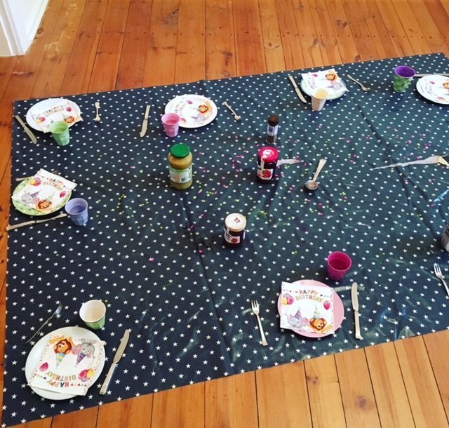 Die Kinder stört das Kisten-Chaos und die ungemütliche Wohnung überhaupt nicht. Also haben wir kurzerhand eine lange Schnitzeljagd draußen gemacht, danach Pfannkuchen-Picknick dem Boden veranstaltet. Die kleinen Gäste fanden es klasse, so was hatten sie noch nie erlebt. Ich habe gesagt: Alles darf mit den Händen gegessen werden. Und so haben wir Unmengen von Pfannkuchen verdrückt und uns dabei schief gelacht. Zum Schluss haben wir noch ein bisschen gebastelt – und das wars.