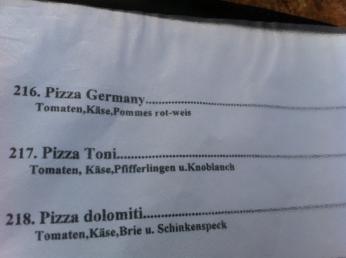 Es ist das Foto der Speisekarte eines Italieniers im sauerländischen Land-Kaff Winterberg (siehe oben), bei dem meine Freundinnen und ich das erste Mittagessen zu uns nahmen… Es gibt dort: Pizza Germany, mit Pommes rot-weiß drauf.