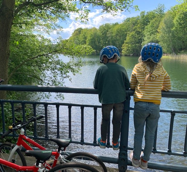 Von Beginn der Krise an war mir klar, dass wir diese Zeit nur mit festen Strukturen überstehen. Und so haben wir fest gelegt, dass wir uns jeden Tag nach der Mittagspause auf die Räder schwingen und in den Grunewald fahren. Noch nie war ich so glücklich, im Südwesten Berlins zu leben und somit ganz nah an diesem riesigen Wald. Wir sind kreuz und quer durch den Wald gefahren, haben Picknicks auf Lichtungen gemacht, Buntspechte beobachtet, Tippies gebaut, die Kinder sind auf Baumstämmen balanciert. Manchmal waren sie so in ihr Spiel vertieft, dass ich mich einfach hinsetzen und mein Gesicht in die Sonne halten konnte.