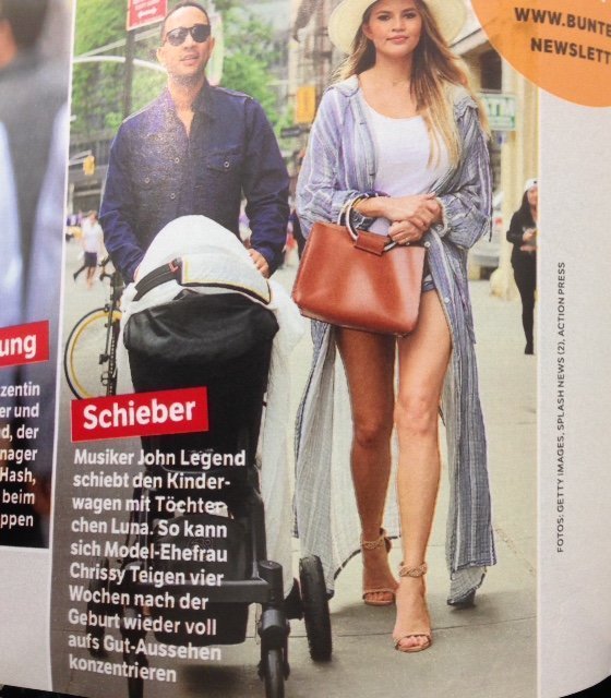 Und dann fiel mir ein, warum ich dachte, ich müsste nach der Geburt schnell wieder schlank, sexy und cool sein. Die aktuelle BUNTE zeigt dazu das beste Beispiel, nämlich ein Foto von Musiker John Legend und seiner Gattin und schreibt dazu: „So kann sich seine Model-Frau Chrissy Teigen vier Wochen nach der Geburt wieder voll aufs Gut-Aussehen konzentrieren.“
