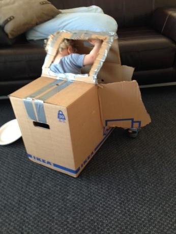 Ja, und dann ging’s los. Mit Gaffa-Tape und Küchenschere. Ich hatte sogar Pappteller und Espressobecher für die Räder und Fahrtlichter besorgt. Mein Sohn hing die ganze Zeit schon halb auf dem Pappkarton, halb auf mir als ich das Ding bastelte. Selbst mit anderthalb Jahren wusste er schon ganz genau: Jetzt kommt was Cooles, für mich, mich, mich…
