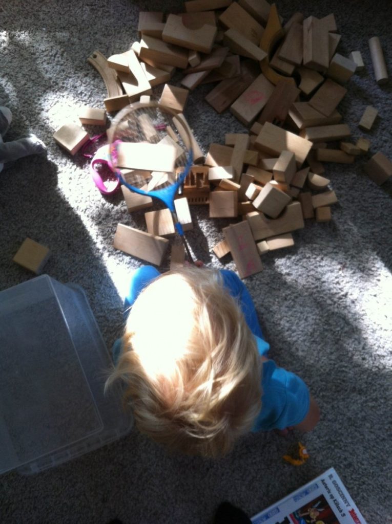 Und hinter mir sitzt einer und baut eine Stadt. Mein Home Office befindet sich im Zentrum der Wohnung – im Wohnzimmer. So spielen wir hier grad Vereinbarkeit. Mama arbeitet am Compi, Kind liegt auf dem Sofa, hört CDs oder setzt sich mal auf den Teppich hinter mir – und baut mit Holzklötzen Städte. Zwischendurch liegen wir übereinander. Oder snacken zusammen. Tag Sieben im entschleunigten Leben durch Krankheit. Klingt doch fast schön, oder?