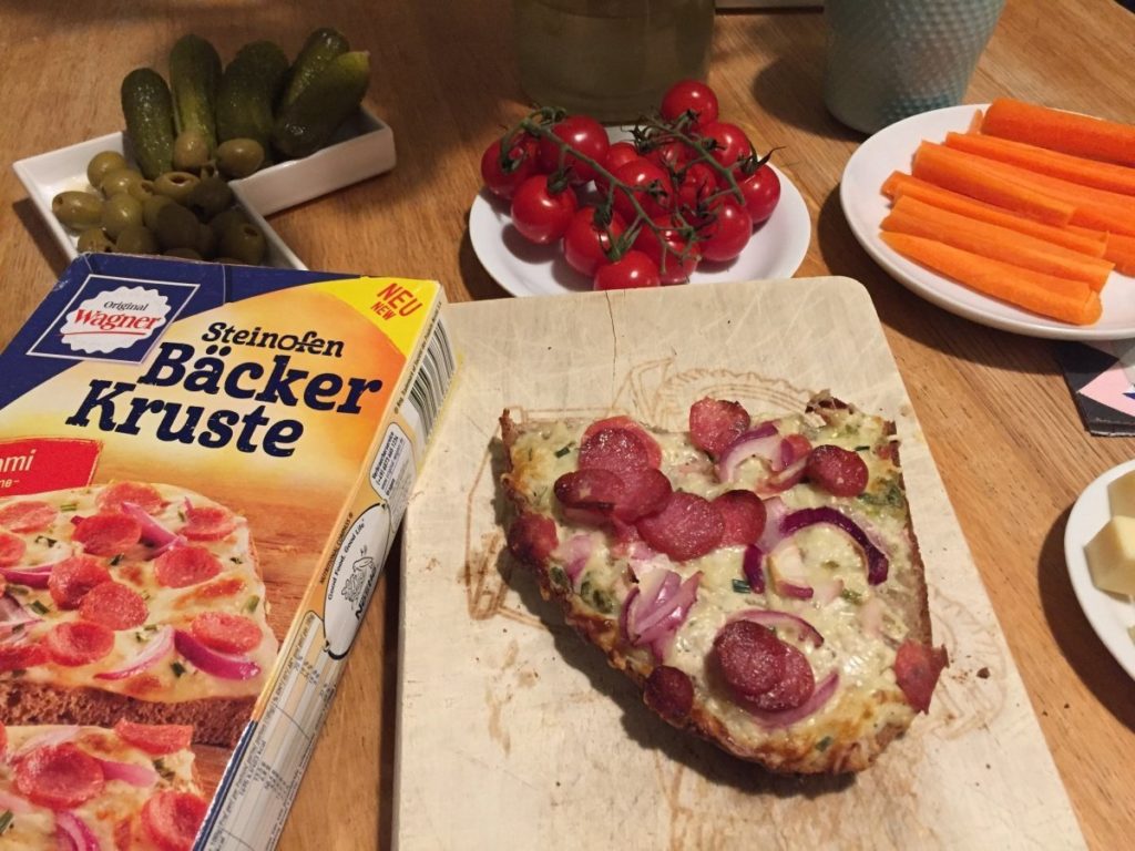 Die Bäckerkruste gibt es mit Schinken, mit Salami oder fleischlos in der Tomate-Käse-Variante. Unsere Kinder sind sich in diesem Falle aber mal einig: Es muss die mit Salami sein. Wie einfach kann so ein Abendessen sein?