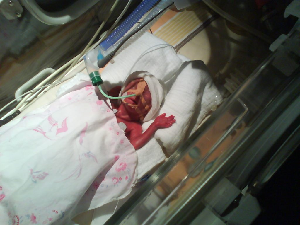 Ich musste sofort ins Krankenhaus. Dort lag ich eine Woche und konnte noch die Lungenreifespritze bekommen, bis ich leichte Wehen spürte. Allerdings war davon auf dem CTG nichts zu sehen. Auf dem Weg zum Ultraschall bekam ich eine schwallartige Blutung (Plazentaablösung) und wurde sofort für einen Not-Kaiserschnitt in den OP gebracht.