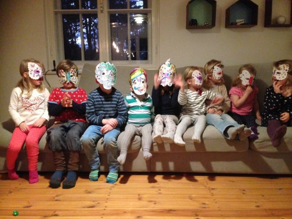 Wir haben nach der Schatzsuche Pappmasken bemalt. Dazu habe ich Glitzersteine und Aufkleber gekauft, die die Kinder auch noch aufkleben konnten. Das kam richtig gut an und danach sind alle mit ihren Masken durch die Gegend gehüpft. Anschließend gab´s ein paar Klassiker: Topfschlagen, Stoptanz und so. Völlig easy, aber den Kindern hat es riesen Spaß gemacht. Weil es ja bei der Schatzsuche und morgens in der Kita schon Süßigkeiten bzw Kuchen gab, habe ich mir auch einen zusätzlichen Kuchen gespart, sondern einfach Kräcker und Salzstangen hingestellt. Abends gab´s dann Mini-Pizzen satt (ja, Tiefkühl-Kost, aber wer bitte stellt sich bei 9 Kindern noch richtig an den Herd????)