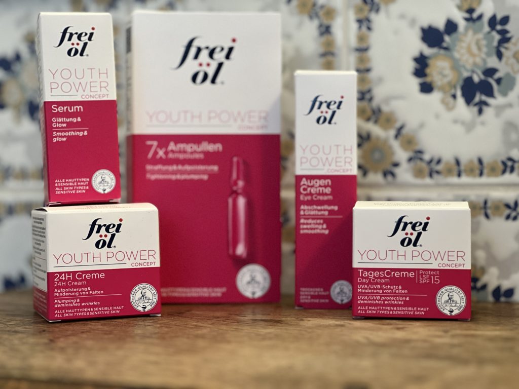 Eine grundsätzlich eher positive Einstellung zum Leben, eine große Lust, neugierig und offen zu bleiben, gute Gene (ich glaube da schon an ein bisschen Glück auch) Bewegung, kein Rauchen, regelmäßig gesunde Ernährung (natürlich nicht immer) und: Hochwertige Pflege. Und da möchte ich euch heute das neue frei öl® YOUTH POWER CONCEPT vorstellen.